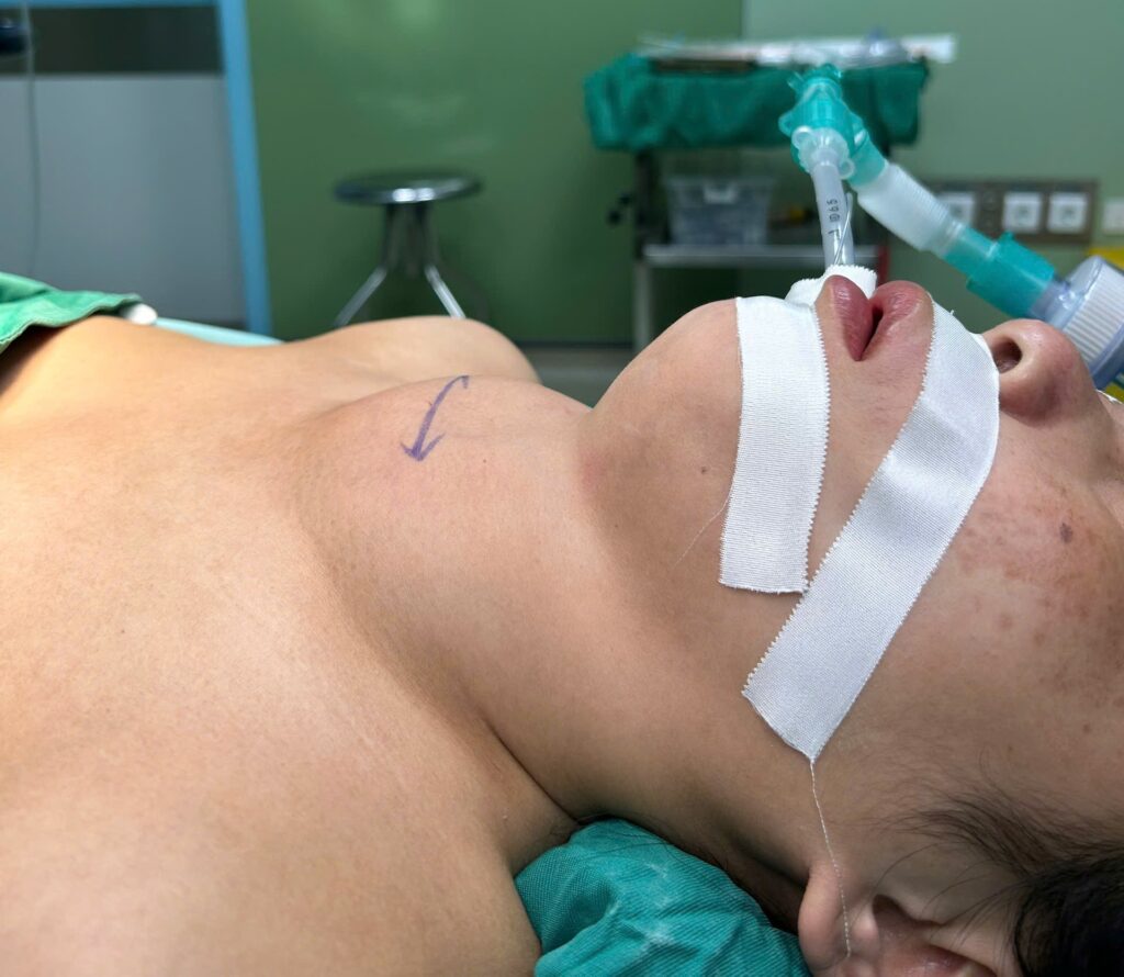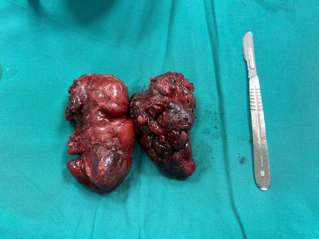 Sau khi hội chẩn kỹ lưỡng, các bác sĩ chỉ định người bệnh cần phẫu thuật cắt bỏ toàn bộ khối bướu để giải quyết triệt để tình trạng chèn ép. Đây là một ca mổ phức tạp do bướu có kích thước quá lớn, đòi hỏi kíp mổ phải thực hiện bóc tách tỉ mỉ để vừa loại bỏ toàn bộ khối u, vừa đảm bảo an toàn tuyệt đối cho dây thần kinh thanh quản và bảo tồn tuyến cận giáp, giúp người bệnh tránh được các biến chứng như khàn tiếng hay co quắp tay chân. Bên cạnh đó, việc kiểm soát chặt chẽ nhịp tim và các chỉ số nội tiết trước khi can thiệp cũng là yếu tố then chốt để đảm bảo an toàn tối đa cho người bệnh trong suốt quá trình phẫu thuật.