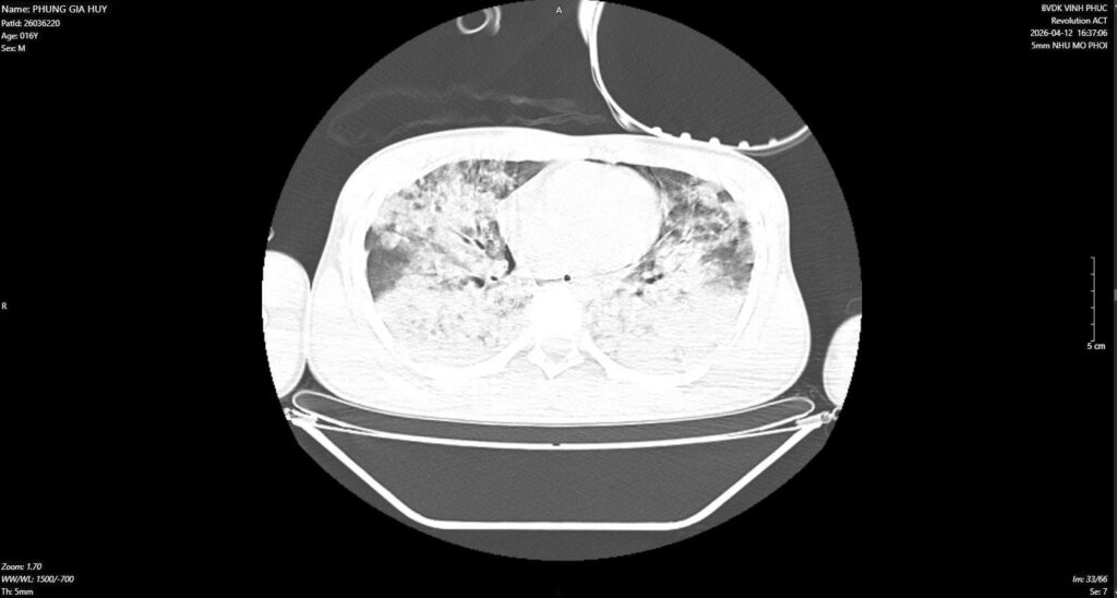 Không chỉ dừng lại ở tổn thương phổi, tình trạng suy đa cơ quan cũng đã xuất hiện, kèm theo toan hô hấp phối hợp với toan chuyển hóa ngày càng nặng. Đáng chú ý, do quá trình cấp cứu ban đầu không có nhân viên y tế nên không thể xác định chính xác có xảy ra ngừng tuần hoàn hay không – yếu tố có ý nghĩa quan trọng trong tiên lượng tổn thương não sau thiếu oxy.