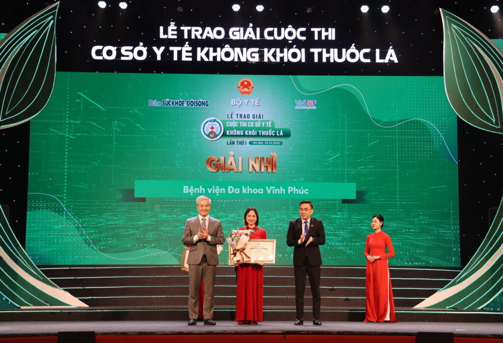 Công tác phòng, chống tác hại của thuốc lá tại Bệnh viện Đa khoa Vĩnh Phúc đã đạt được những kết quả tích cực. Năm 2025, bệnh viện vinh dự đạt giải Nhì cuộc thi “Cơ sở y tế không khói thuốc lá” do Báo Sức khỏe và Đời sống phối hợp với Quỹ Phòng, chống tác hại của thuốc lá tổ chức. Thành tích này là sự ghi nhận cho những kết quả và giải pháp hiệu quả mà bệnh viện đã triển khai trong việc xây dựng môi trường y tế an toàn, văn minh, không khói thuốc.